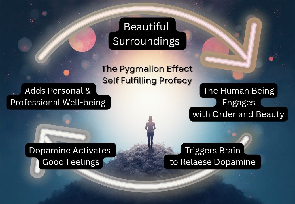 Both the Pygmalion and Golem Effects can be used wittingly or unwittingly. Either the Pygmalion Effect will uplift you, or the Golem Effect will derail you. Beauty awakens the soul to its potential. It triggers positive emotional responses in the brain and influences our personal performance. In our illustration, instead of a teacher or parent affirming, it is the environment that is encouraging you, influencing your performance. The inclination to goodness, which enables positive outcomes, is being articulated by a homes interior design. This is why we believe that beauty is not something that would be nice to have, but something that we need to have.  When we experience beauty, our brains release dopamine–the “feel-good” chemical–and stress hormones begin to drop. To borrow a humorous line spoken by Legally Blonde darling, Elle Woods (Reese Witherspoon)
