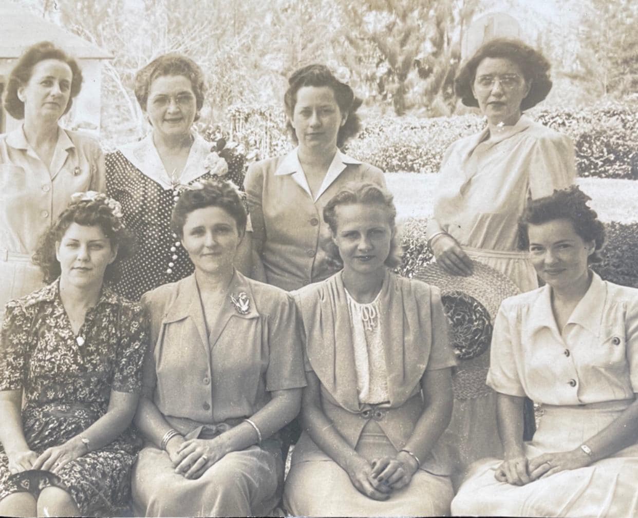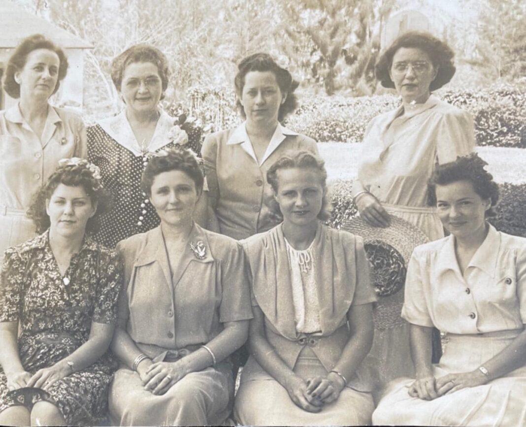 The 1943 photo is of the principal and officers of the Miami Springs Elementary School PTA, top row left to right, Mary Kniffen, school principal Mrs. Era May Furr, Mrs. James and Mrs. Elizabeth Madeira, bottom row Mrs Hearh, Peggy Filer, Mrs. Madeleine Robinson, Mrs. Gus Halwardson. Mary Kniffen’s husband Walter Kniffen served as Miami Springs Chief of Police before the war and was killed in action Feb 23, 1945 in the battle of Iwo Jima.